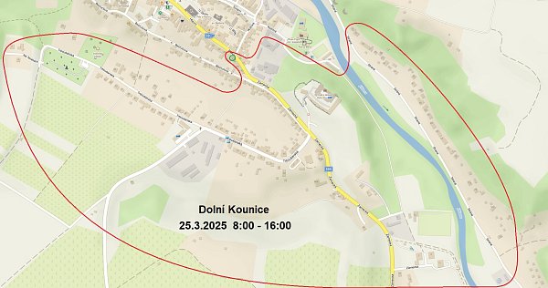Dolní Kounice - Zámecká, - Trboušanská včetně samoty č. e. 207 a 208 směr Trboušany, - Hlavní od Zámecké po č. p. 94/25 a 82/30 mimo č. p. 84/32, - Růžová č. p. 107, - Stráně mimo č. p. 181, 497, 600, - Na Terasách, Odběratelská trafostanice D. Kounice Statek (č. 6180), Odběratelská trafostanice D. Kounice ČOV (č. 700606)