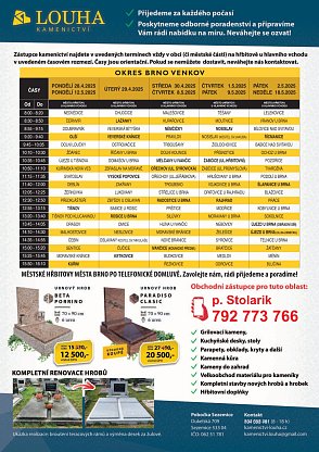 ve středu 30. 4. a čtvrtek 8.5 2025 přijede na hřbitov zástupce Kamenictví Louha s.r.o. v čase 10.10 – 10.30 hodin.
