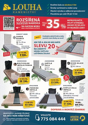 Firma nabízí nové celo-žulové hroby, krycí desky, rovnání pomníků, čištění a renovace terasových hrobů obnovu písma. Kompletní kamenické práce za velice příznivé ceny- slevy až 35% !