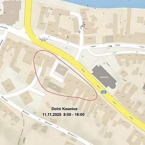 Vypnutá oblast: Dolní Kounice - Masarykovo náměstí levá strana od č.p. 64/4 po Hlavní, - Hlavní levá strana od Masarykova náměstí po č.p. 72/8.